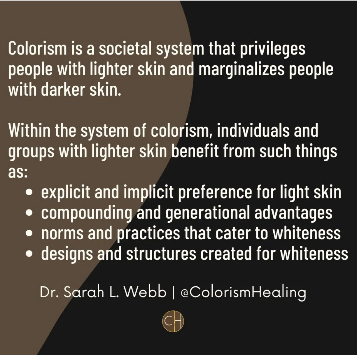 Colorism, which is a form of internalized oppression, has been defined by Dr. Sarah L. Webb (She/Her) as the marginalization that darker skinned individuals experience on an individual and systemic level.