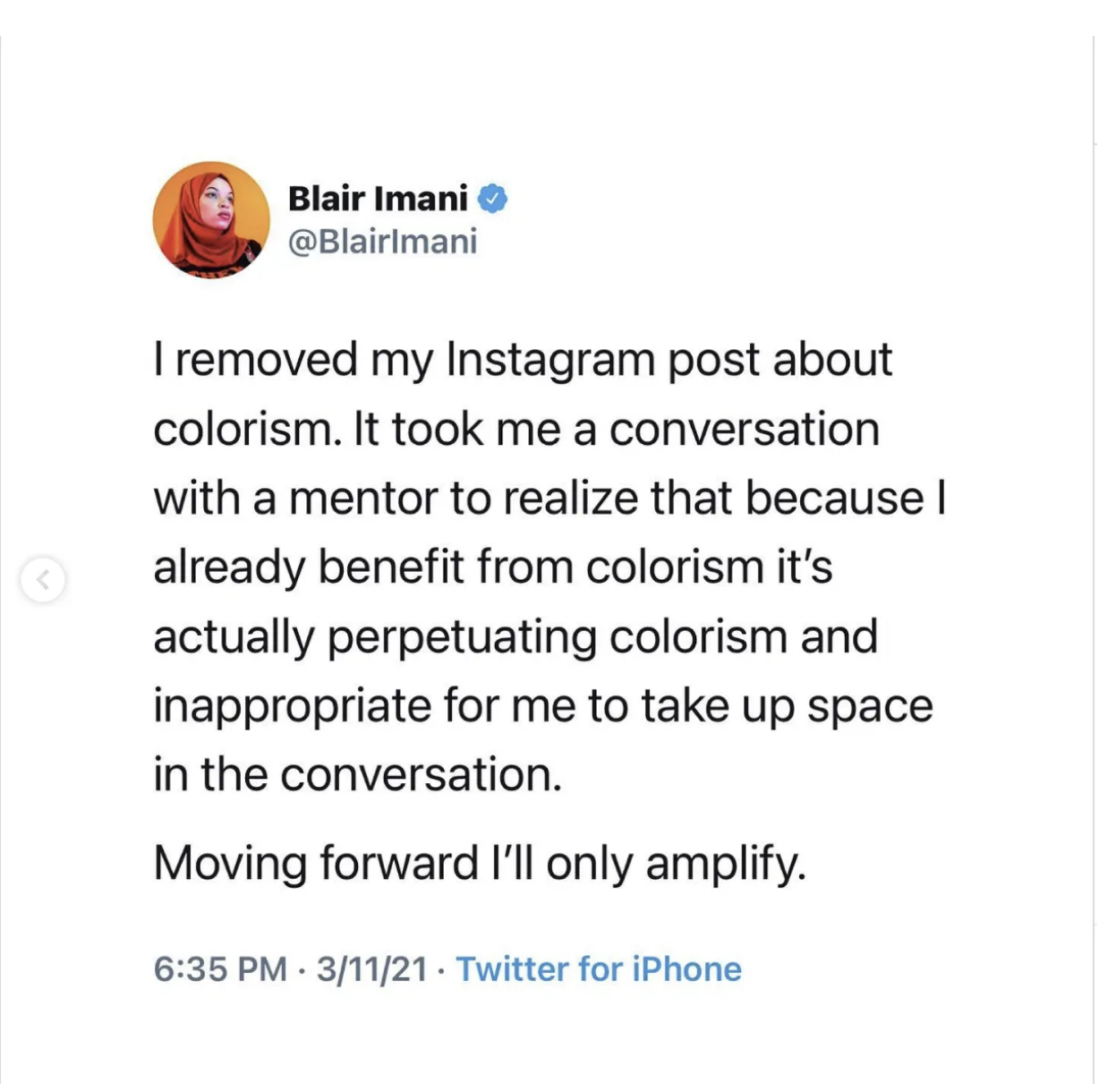 Acknowledging your differences will help acknowledge when you are being discriminated against. I acknowledge that there are people who are darker and lighter than me. This acknowledgement will also assist me in amplifying certain voices and removing myself from spaces when needed. The Darkest Hue is another great place for me to learn about colorism and misogynoir in popular culture, film, politics and more but I am aware it is “a Safe Space for *Dark-Skinned* Black Girls, Women, and femmes” so I would never center my voice there.