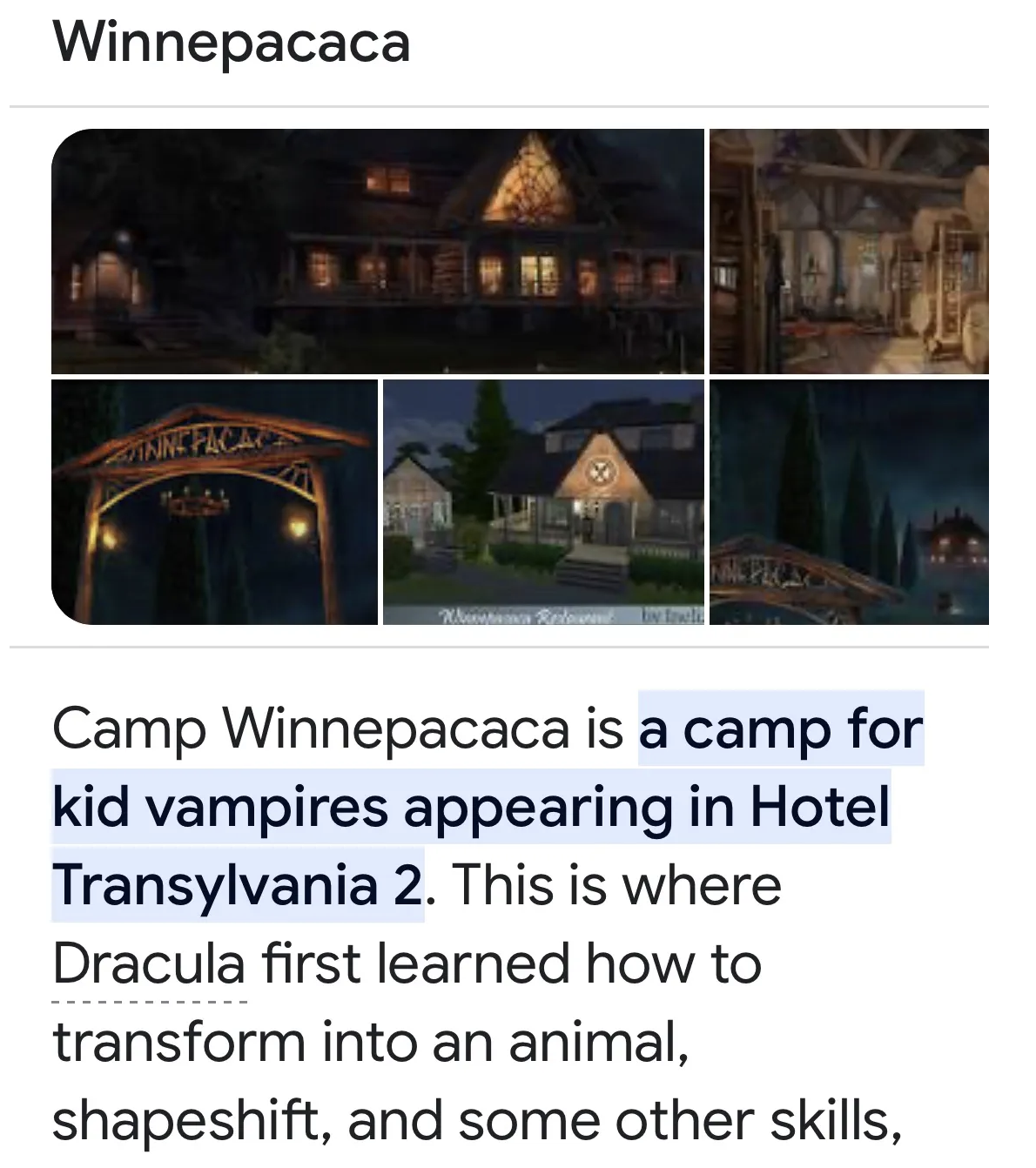 Other examples can be found in the Hotel Transylvania franchise, i.e. Camp Winnepacaca, a made up name to insult traditional Indigenous language.