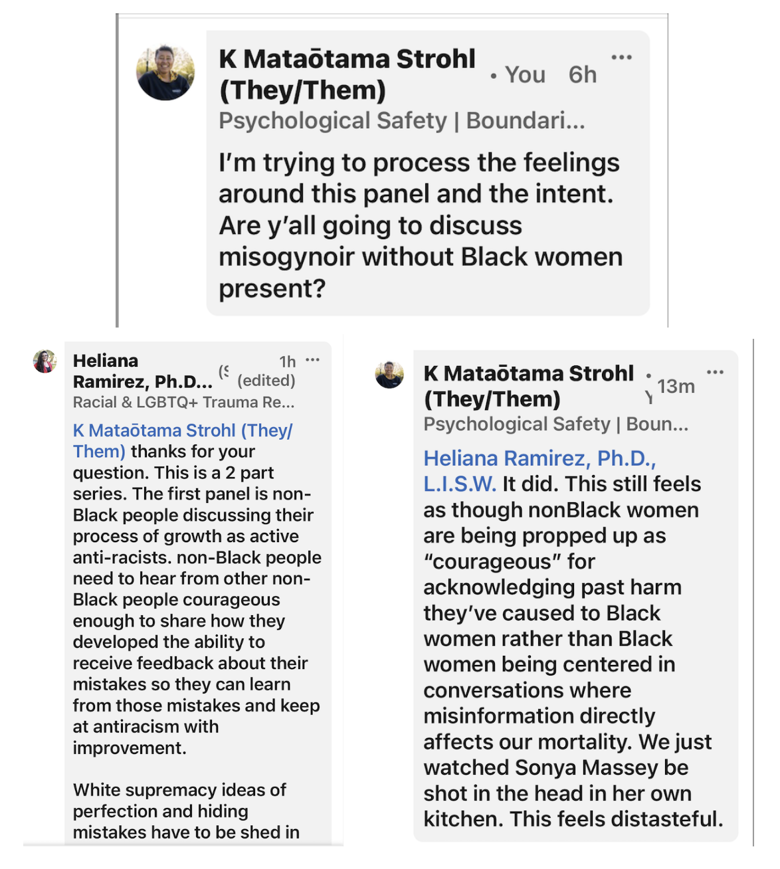The very telling part of the facilitator's comments and how I know this event will do more harm than good is the deflection of blame unto White people and the "involved" unnamed Black women. White supremacy culture is a culture we are all capable of partaking in. The facilitator may want the audience to believe this is to benefit Black women but that's not possible when these nonBlack women are propping themselves as more than capable of having/leading these conversations without us.