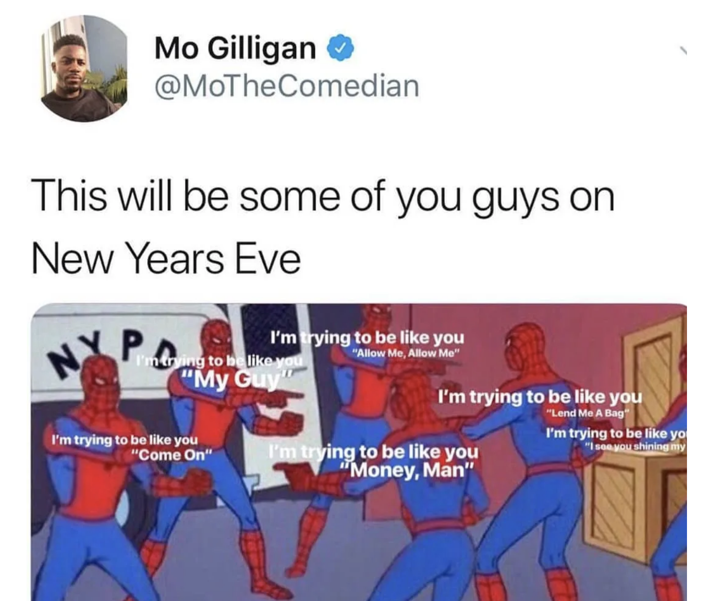 I think about the ways I was verbally shown love as a child. Often it was through roasting or joking. There was always a thin line there. I also think about how I was socialized to respond to compliments. A lot of good examples can be found in the Spider-Man meme below.
