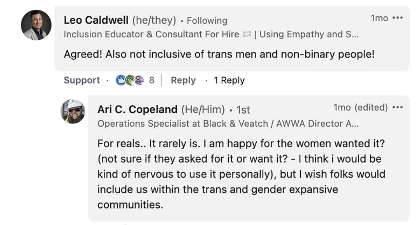 Pharoah Bolding (He/Him), The World’s Greatest Comic-Drawin’ HR Consultant, shared his thought on the policy in a LinkedIn post. Many people responded but the comments left by Leo Caldwell (He/They) and Ari C. Copeland (He/Him) confirmed that the policy, while terrible to start, was also not as inclusive as it presented itself to be.