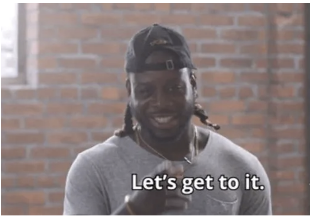 A Black person stands in front of a brick wall smiling and points saying “Let’s get to it.”