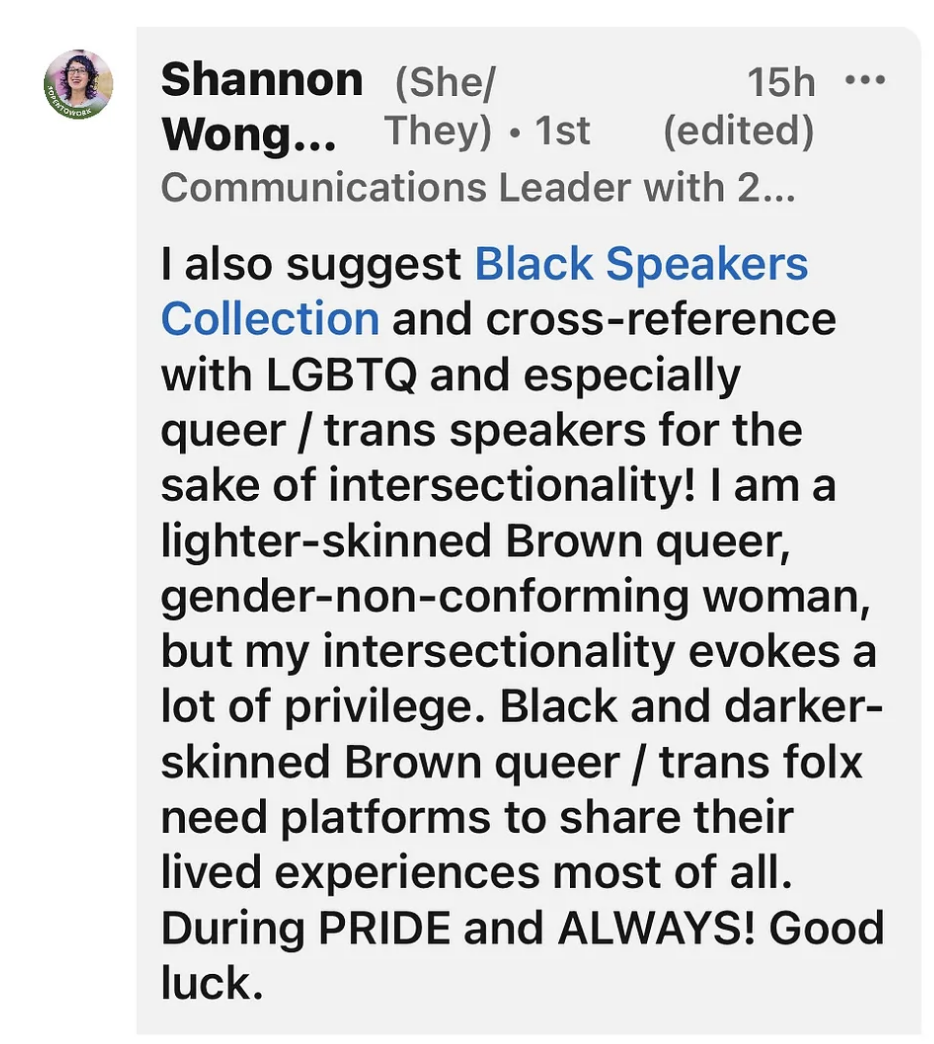 As soon I was getting excited, the comments reminded me of who is always centered for Pride. The comments after mine recommended the same thin White voices I see constantly. I was reminded that when people think Pride, they think thin White people, even when asking for trans speakers.