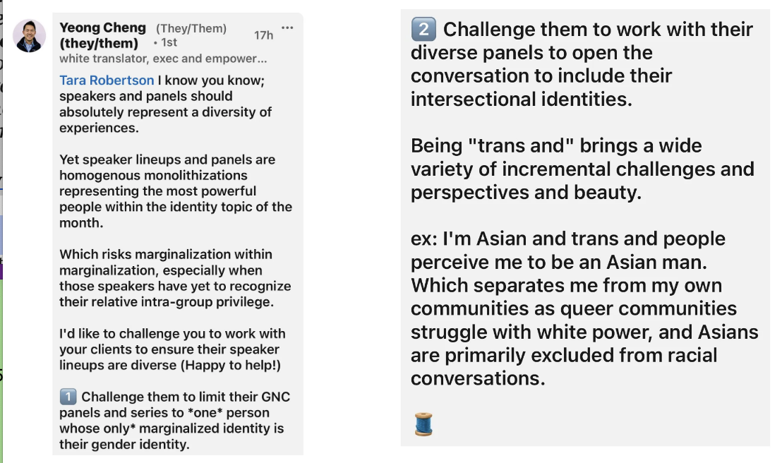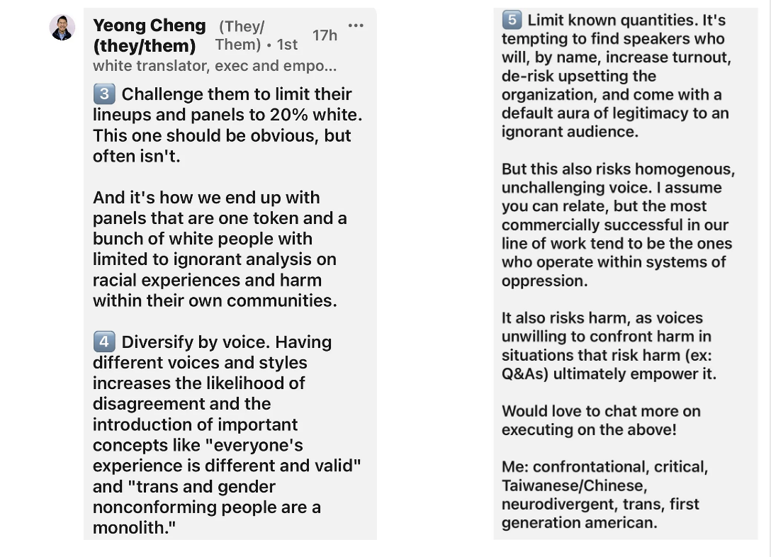 This reminder along with many Black speakers saying they were booked extremely less this year for Black History month really discourages me from continuing to do the work that I do. I was, however, delighted to see Yeong Cheng (They/Them) and Shannon Wong (She/They) make several comments encouraging others to take notice of who they were centering. Yeong specifically went in on how “speaker lineups and panels are homogenous monolithizations representing the most powerful people within the identity topic of the month.” They provided several comments that made sure to explain why and how “we end up with panels that are one token and a bunch of white people with limited to ignorant analysis on racial experiences and harm within their own communities.”