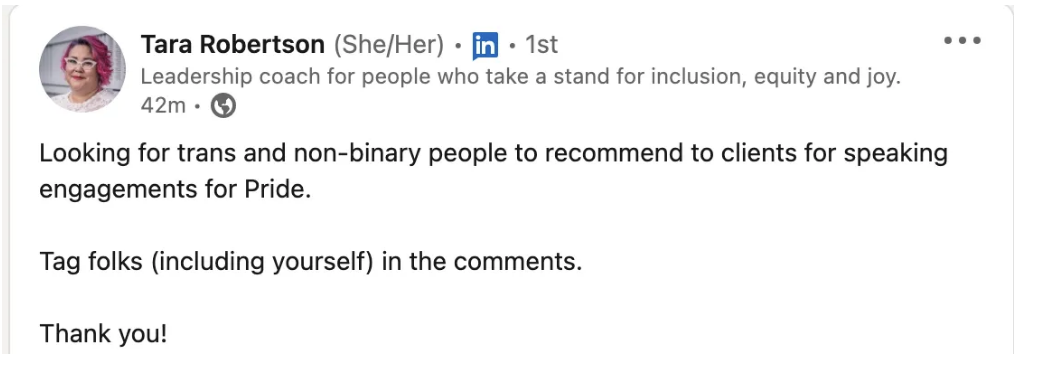 Recently I saw a post by Tara Robertson (She/Her) asking for trans and non-binary people for Pride speaking engagements.