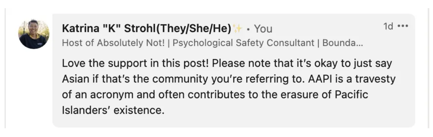 I am Black and Sāmoan. AAPI (Asian American and Pacific Islander) is a travesty of an acronym that contributes to the erasure of Pacific Islanders’ existence.