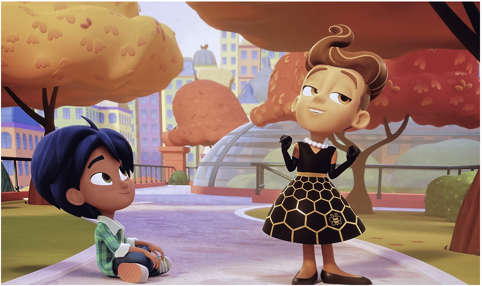 Bread Pudding shows HuckleBerry his costume in Netflix’s Strawberry Shortcake and the Beast of Berry Bog.