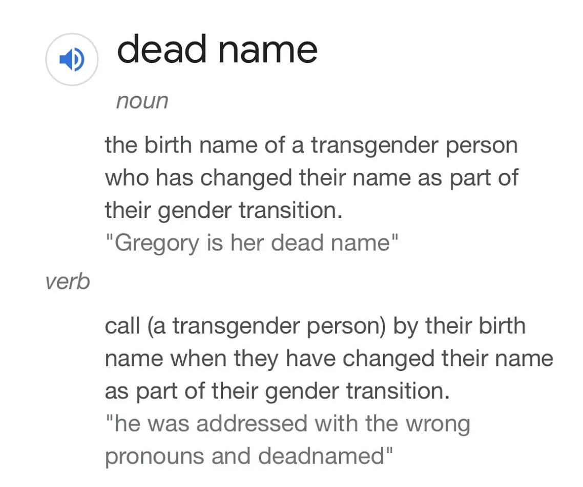 Many transgender people change their names to assist in affirming their gender. It is not required and those who don’t are not any less trans. Should a person change their name to affirm their gender, using their previous name would be dead naming them.