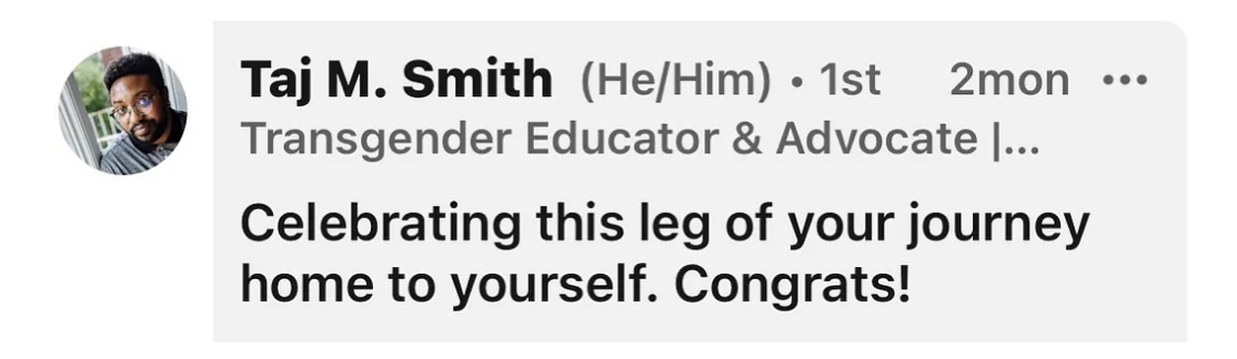 A screen capture of Taj M. Smith (He/Him) congratulating K on their journey home.