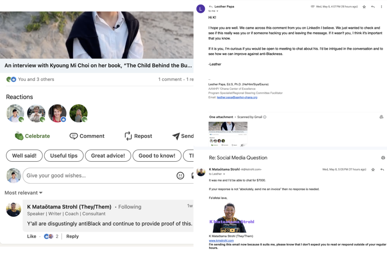 Last night, I received the email below from Lesther Papa of the AANHPI ‘Ohana Center of Excellence and responded immediately. AntiBlackness isn't just the N word and burning crosses, it is also playing in Black people's faces the way you would never ever play in anyone else's. It is the devaluing of and overall dehumanization of Black lives. It is finding our concerns, protests, needs, time and work laughable.